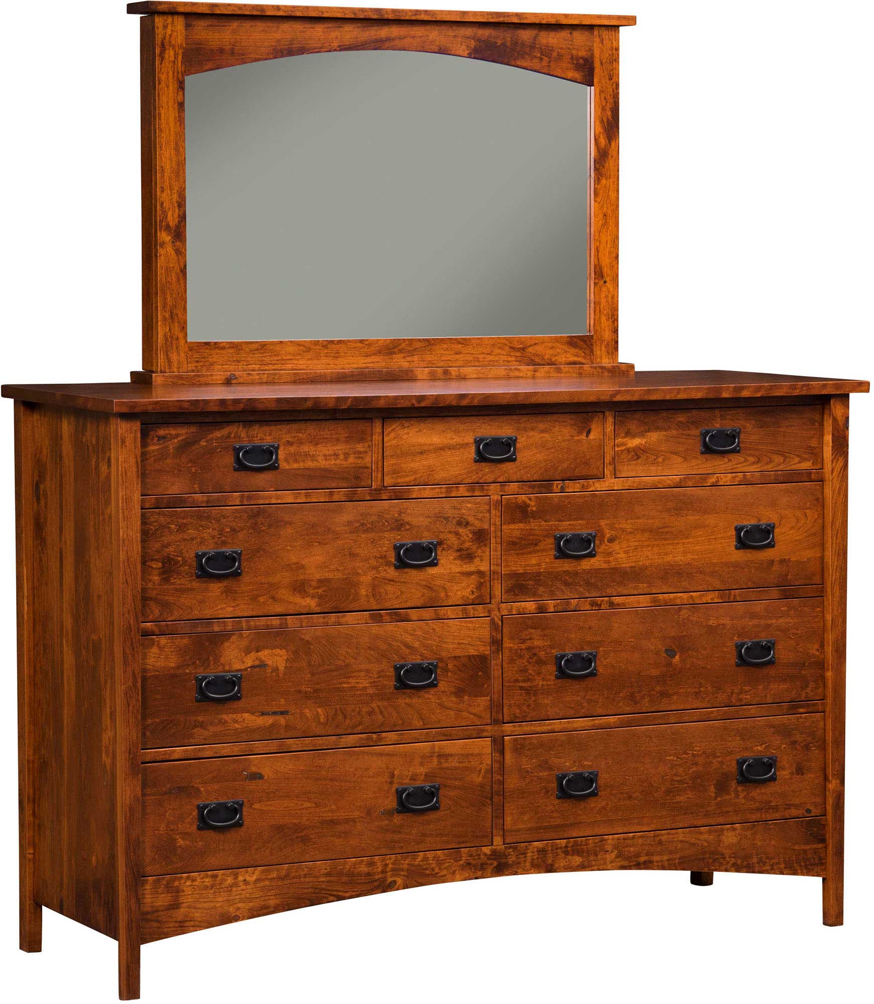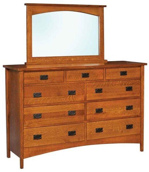 This Mission-style Arts and Crafts High Dresser with Mirror blends timeless elegance and lasting durability. Featuring nine drawers for ample storage, it’s accented with graceful arches, classic corbels, and tapered legs. The plain mirror and clean lines highlight the handcrafted detail, making it a perfect centerpiece for any bedroom. Built with heirloom-quality construction and available for quick-ship, this piece offers both beauty and practicality for generations to come.