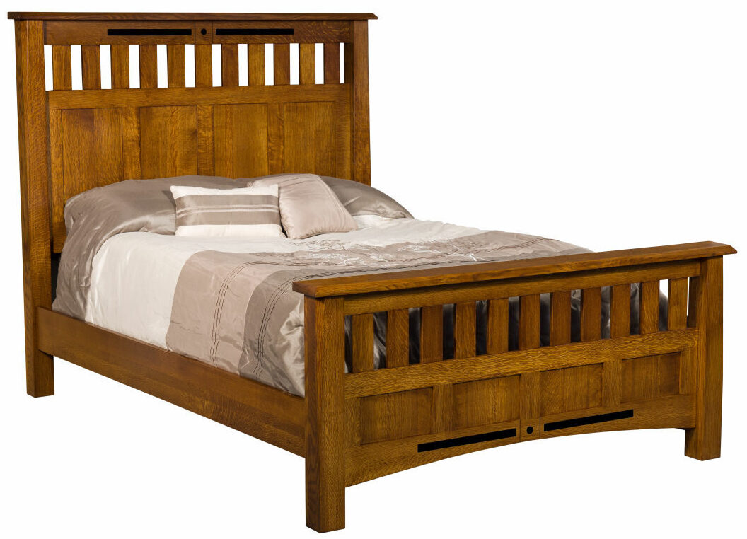 Imagine head-turning slats, ebony inlays, and reverse panels in the same bed! These features combine to make the Bel Aire Slat Bed a most elegant centerpiece of your bedroom! Amish cabinetmakers build the unit from quarter-sawn white oak and finish it with Michael’s Cherry stain. So, the bed is heirloom-quality. And it’s ready to ship.