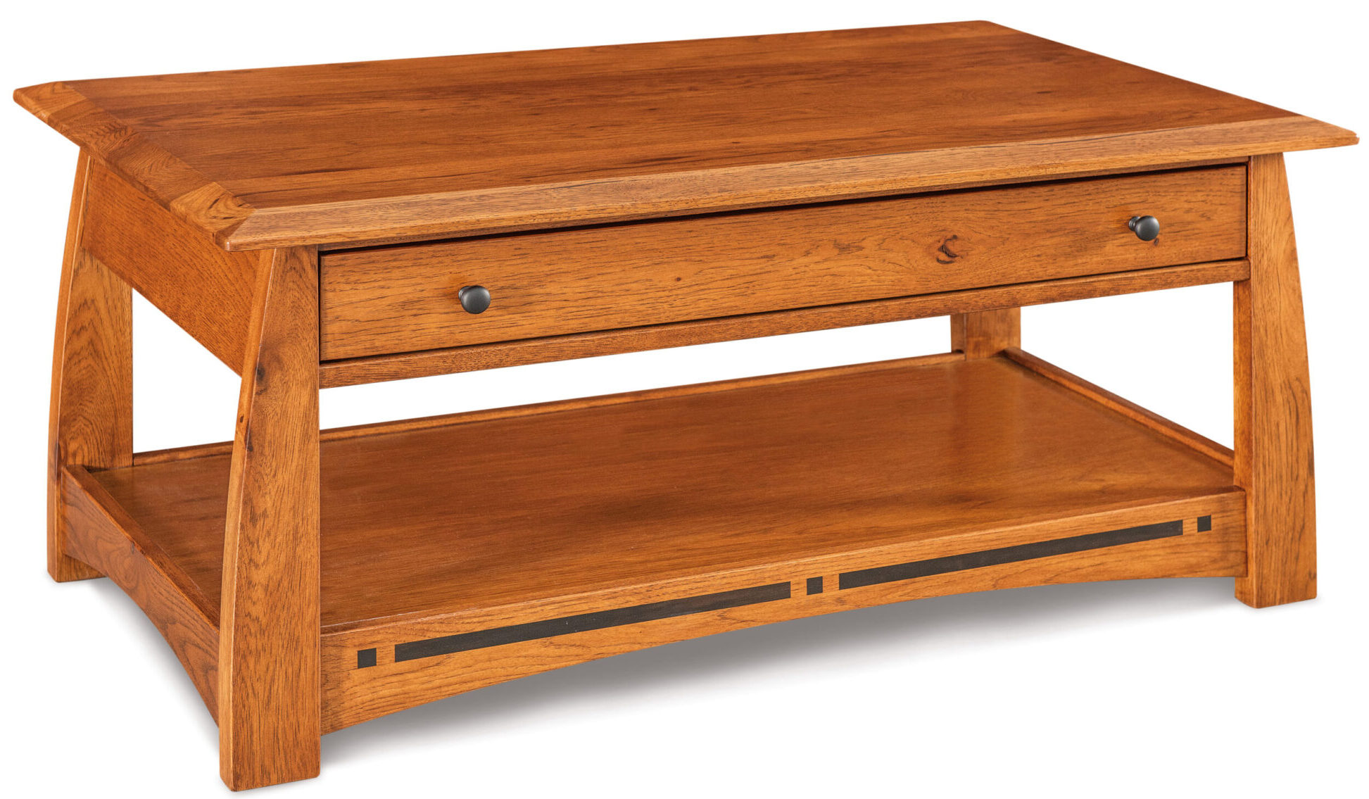 From the 1-inch-thick solid hardwood top to the arched skirting with ebony inlays, the Boulder Creek Coffee Table dazzles you with its warm, contemporary look. Its curved legs and black knob hardware enhance the appeal. Also, the drawer opens full extension for easy access. Amish artisans build the coffee table. And they use rustic hickory. No wonder the table is so sturdy. Plus heirloom-quality!