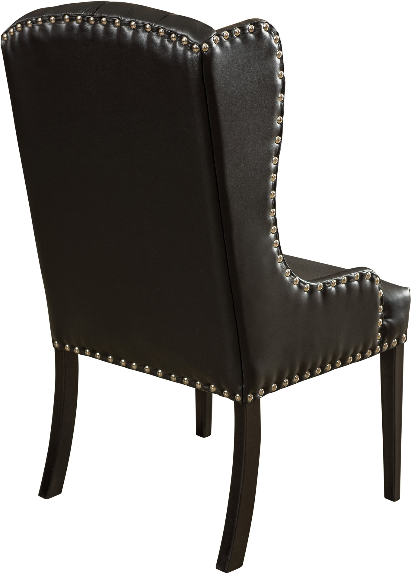 The Bradshaw Kitchen Chair brings forth a vintage elegance to fit your trendy dining room. This upholstered chair offers great lumbar support. In other words, this chair is comfortable. Also, notice the nail heads along the outer edge of the chair, these are standard. The four legs are built from Brown Maple wood with an Ebony finish.