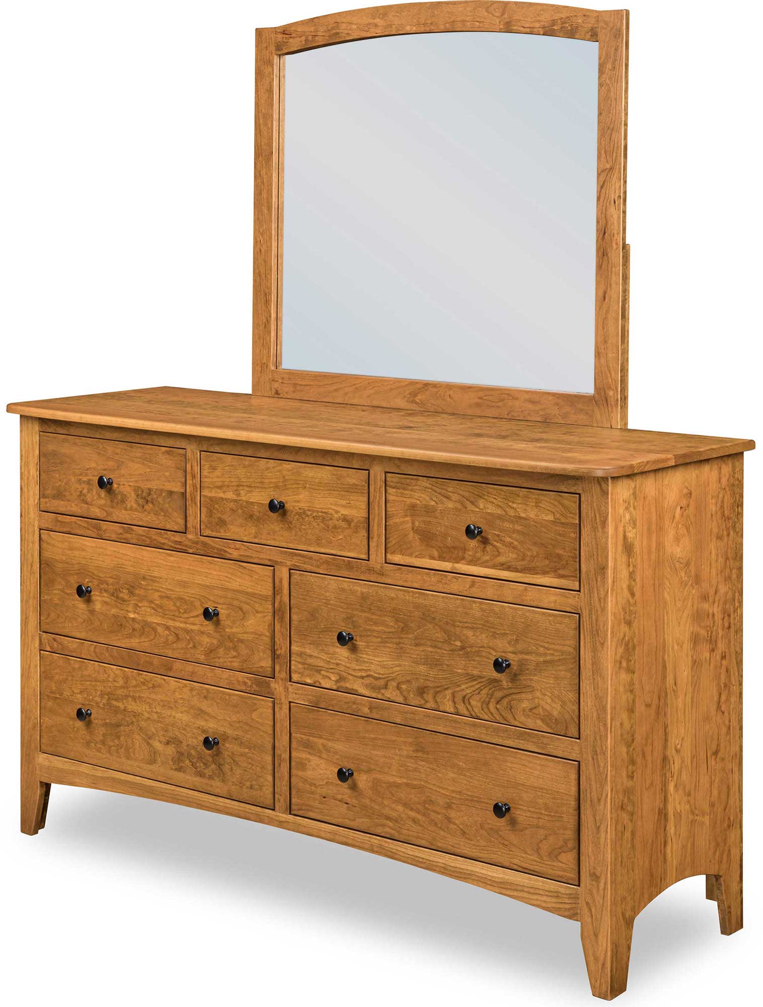 The Carlston Dresser and Mirror catches the eye with its graceful arches and flush drawer fronts. Plus black knob hardware. What a lovely piece for your bedroom! The seven drawers open full extension. This means easy access to everything. Even to items at the back of each drawer. At the same time, dovetail drawer joints enhance durability. Amish artisans build the dresser from sap cherry wood. Also, they utilize standardized construction. Plus, a streamlined production process. So, the dresser is top-quality. Sturdy. And heirloom-quality! It also comes at a great price. Also, we offer the dresser through our Quick Ship program. Which means it will arrive faster. Buy now by placing the dresser in the Shopping Cart. We ship. You can also pick up your furniture at our affiliated warehouse in Shipshewana, Indiana.