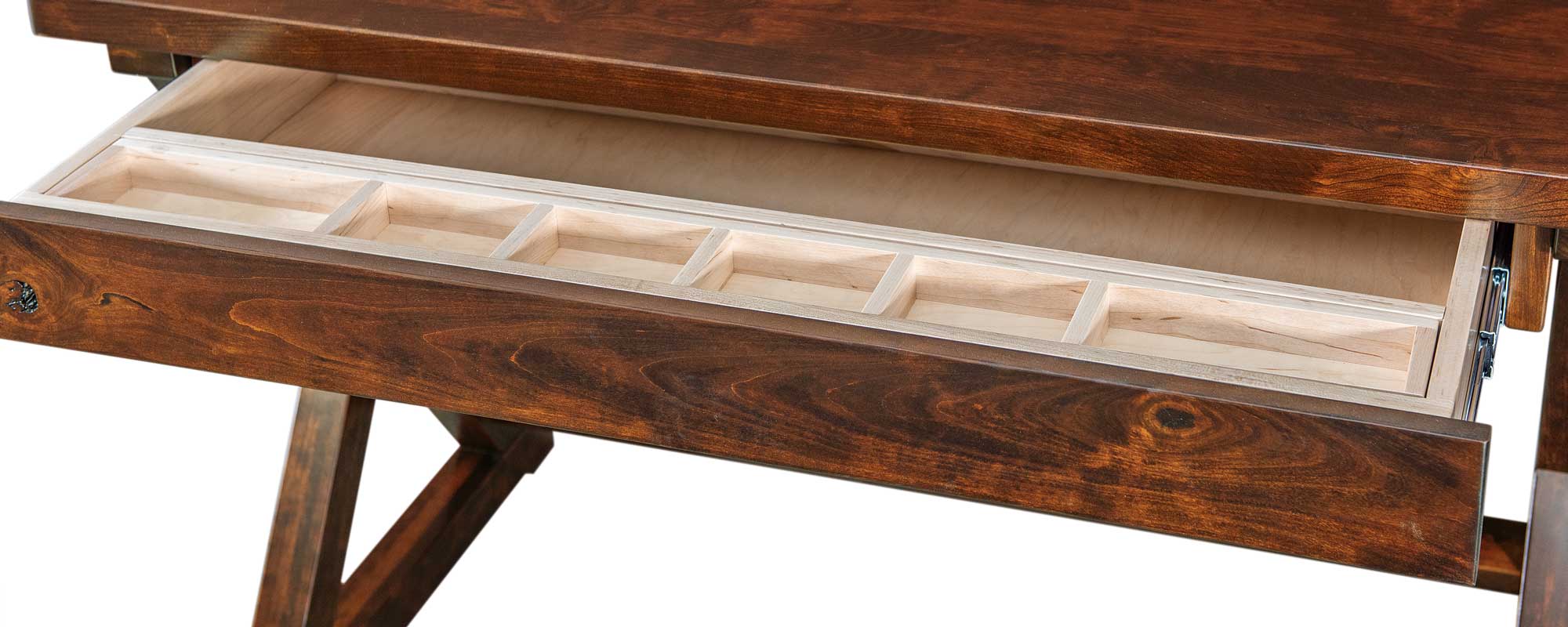 The classic, yet trendy Dexter Writing Desk makes the perfect centerpiece to your modern office. Amish artisans built the desk. And they used rustic cherry hardwood. In fact, natural cherry knots are visible amid the dark red finish. Also, you’ll find the multiple compartments in the wide pencil drawer rather handy. And the desk is so sturdy, it’s heirloom-quality!