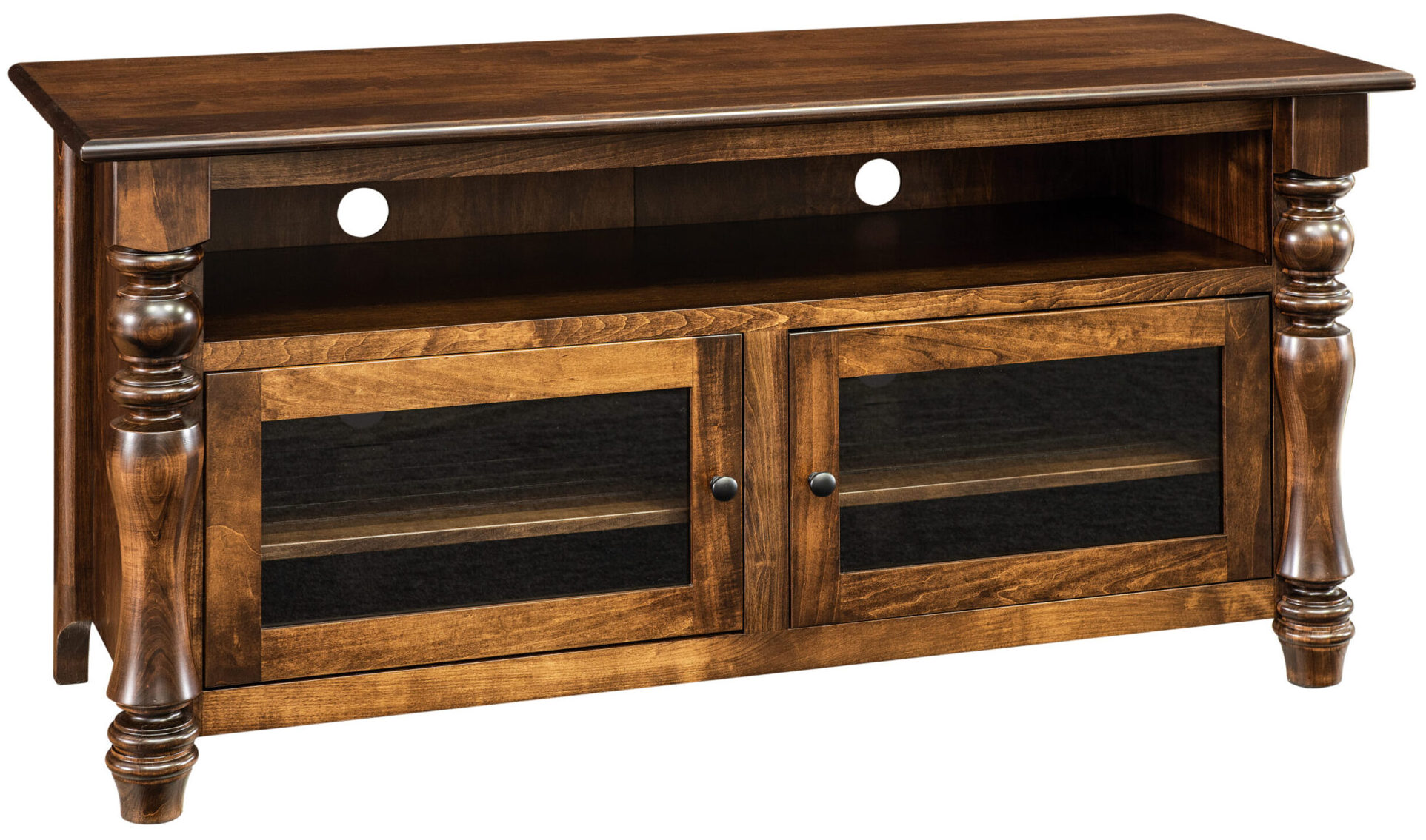 The Empire TV Stand is elegantly constructed. This TV stand is built from regional Brown Maple. The extra detail on the front of the stand cast vintage visions. The space at the top of the cabinet is perfect for projecting clear sounds from sound bars and speakers. The doors are lightly tinted so your receivers will function properly while hidden. Additionally, there are several small holes in the back of the cabinet so all the cords can be hidden.