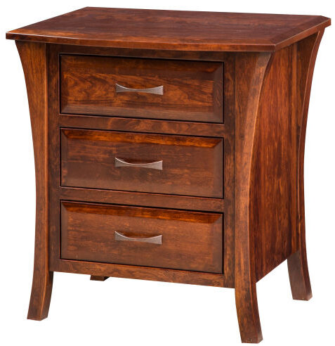 With its gracious curves, beveled drawer fronts, and antique hardware, the Ensenada Nightstand adds a stylish and trendy touch to your bedroom. The three drawers open full-extension, giving you easy access to everything inside. Amish cabinetmakers handcraft the nightstand. And they use sap cherry hardwood – with a red-brown finish. So, the nightstand is stylish, sturdy, and heirloom-quality! The piece is also a Quick Ship product. This means it arrives fast. Buy now by placing the nightstand into the Shopping Cart. We ship. You can also pick up your furniture at our affiliated warehouse in Shipshewana, Indiana.