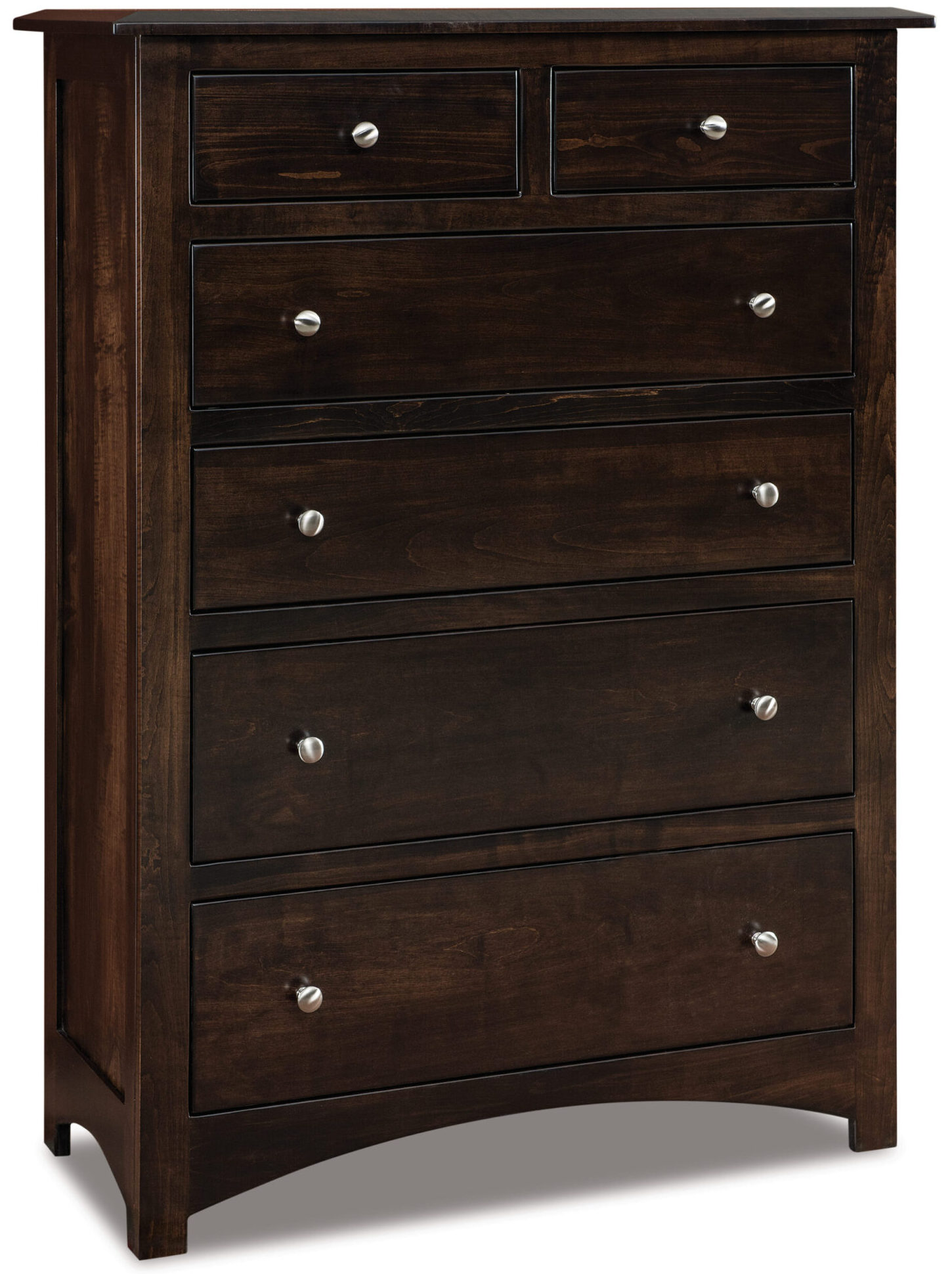 The Finland Chest of Drawers delights the eye with its flush drawers, silver knob hardware, and graceful arches. Also, the drawers are spacious. And they open full extension. So you’ll enjoy easy access to everything inside. Amish cabinetmakers – the best in the Midwest – handcraft the chest. And they use solid hardwood. No wonder the chest is so sturdy. Durable. Plus heirloom-quality!