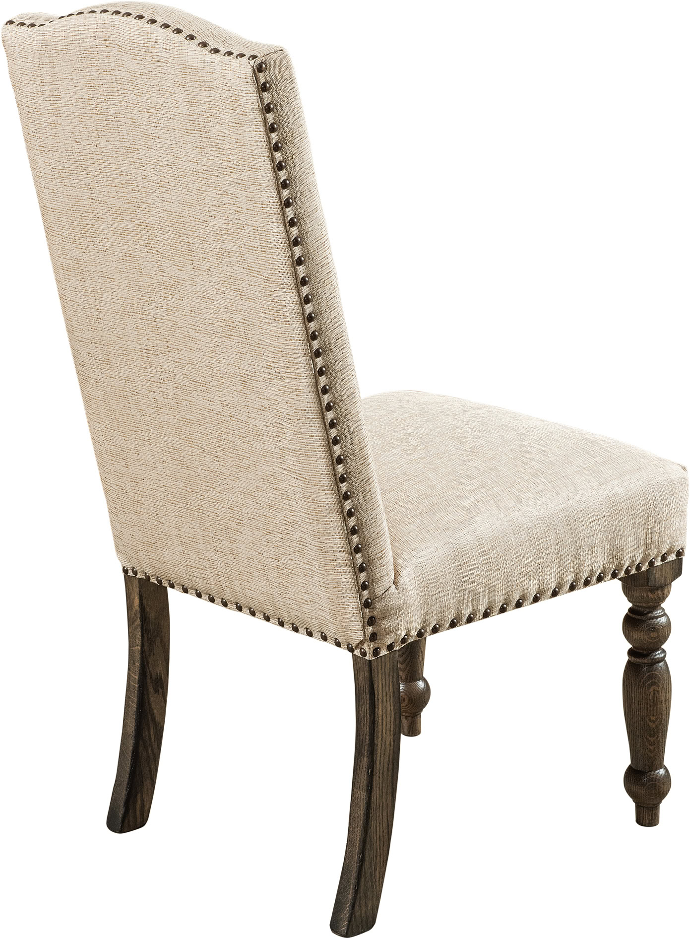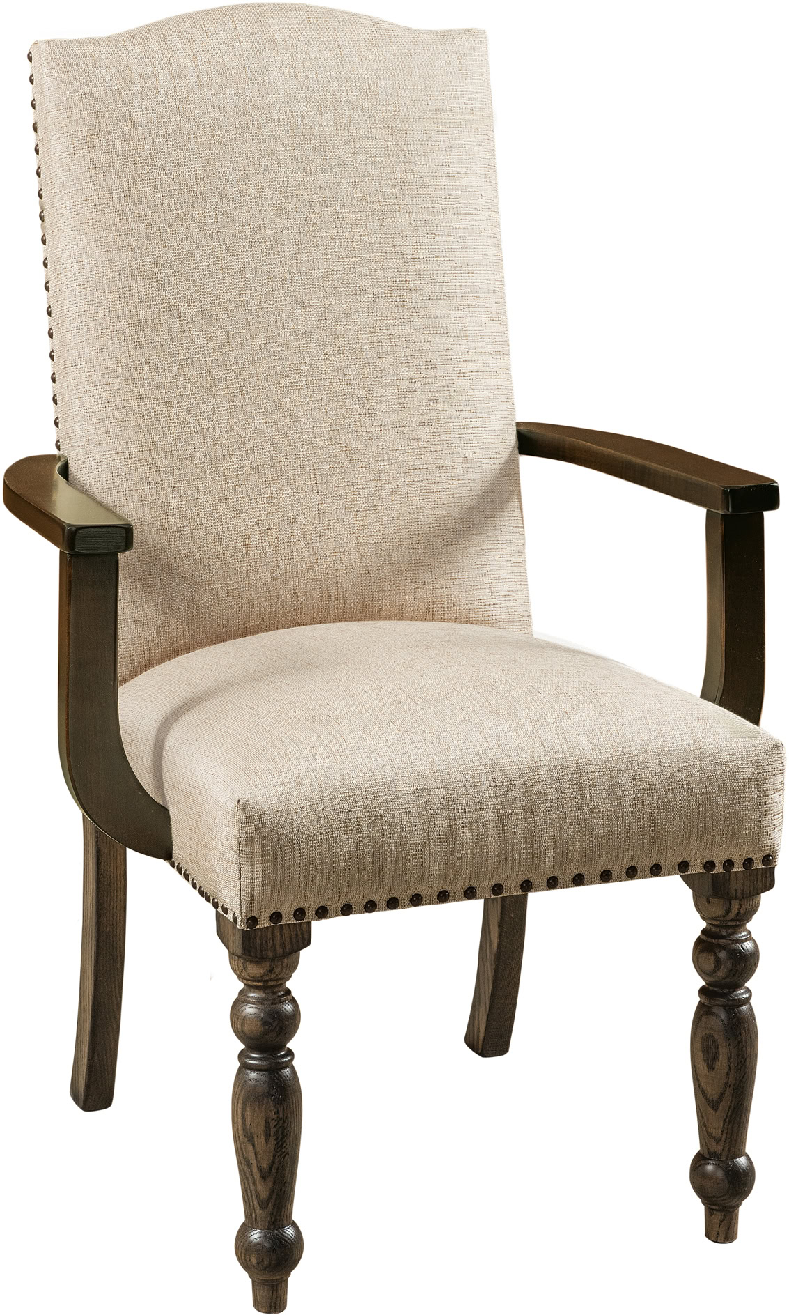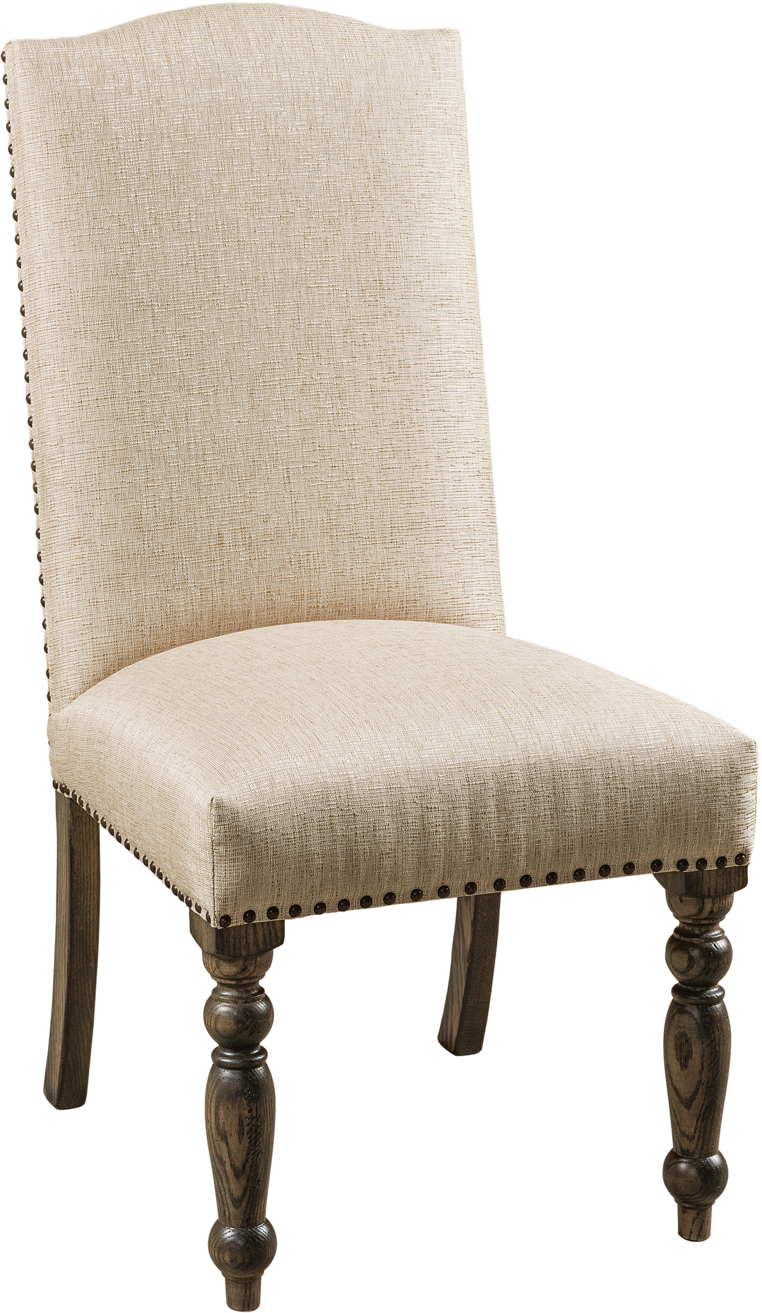 The Olson Kitchen Chair is bringing vintage back with the plush upholstery and its nail head trim. Another vintage design feature is the two front legs, spindled and sanded down to give it that retro look. This chair is available in Brown Maple wood and is shown with Weathered Grey Wood finish. This side chair is also available as an armchair.