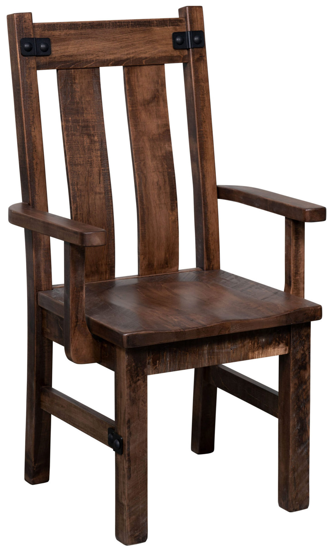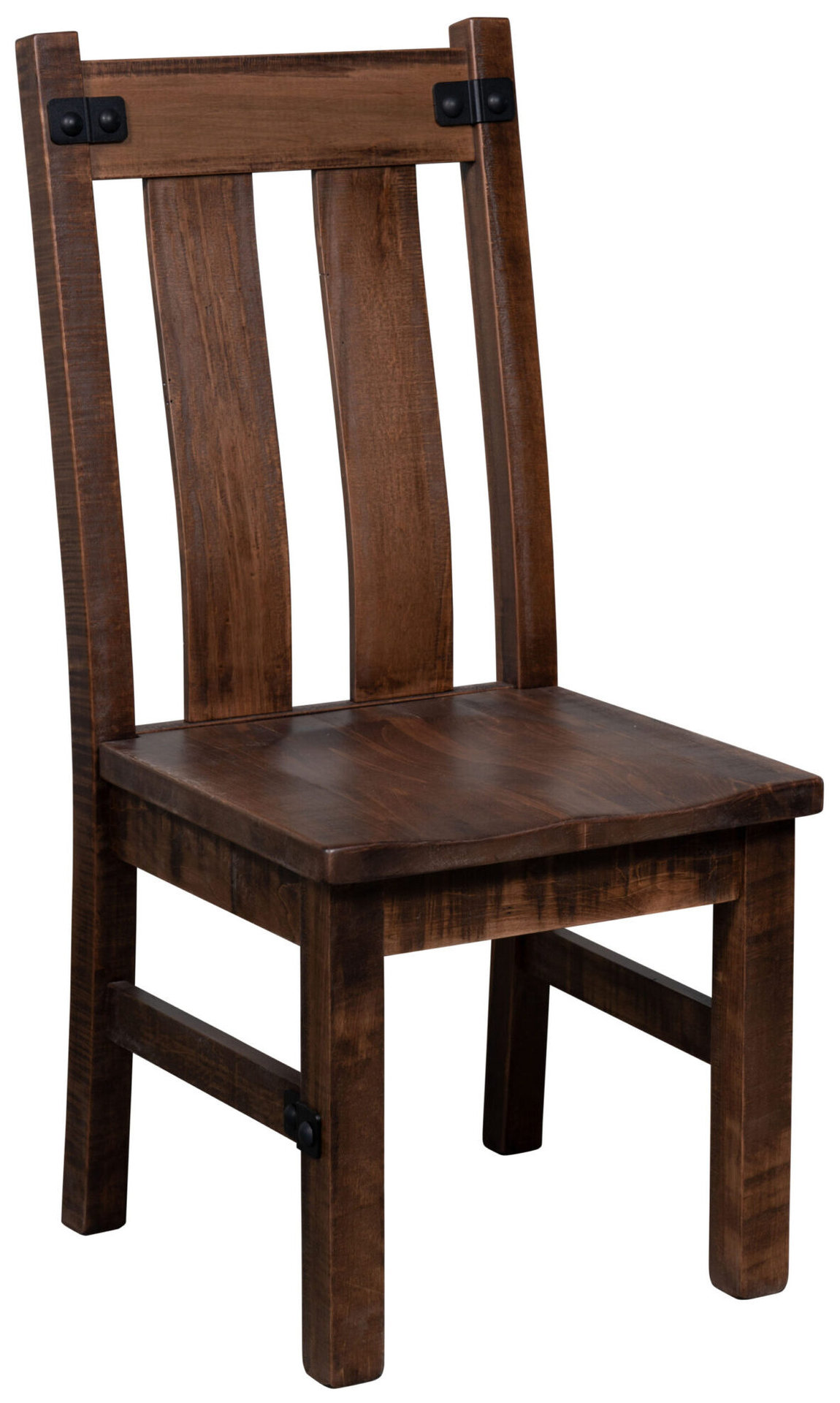 Elegantly designed with two wide slats and Mission-like simplicity and stateliness, the Orewood Dining Chair also features a rustic side. The chair is built from rough-sawn wormy maple to which metal accents are attached. Yet, the smooth, curved slats and scooped seat enhance comfort. Amish cabinetmakers — the best in the Midwest — build the chair. No wonder it’s so sturdy and heirloom-quality!