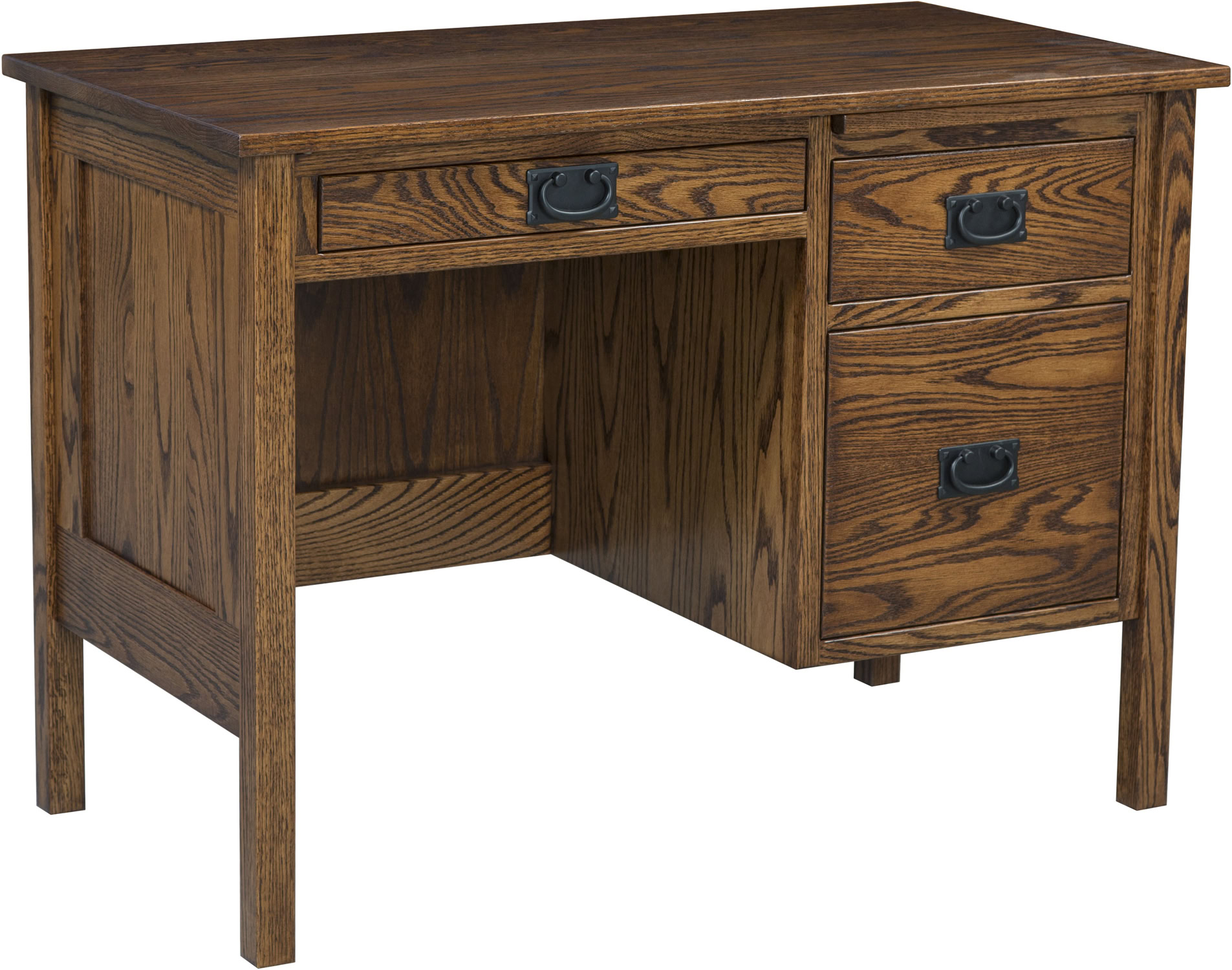 The smaller-size Post Mission Pedestal Desk is ideal for a young student’s room — or for your home office/workstation. The desk features full-extension drawers for easy access plus a pull-out writing board to extend the workspace. Drawer locks are also available for added security. Amish cabinetmakers build the desk from red oak and finish it with Asbury stain. So, the desk is heirloom-quality. And it’s ready to ship.