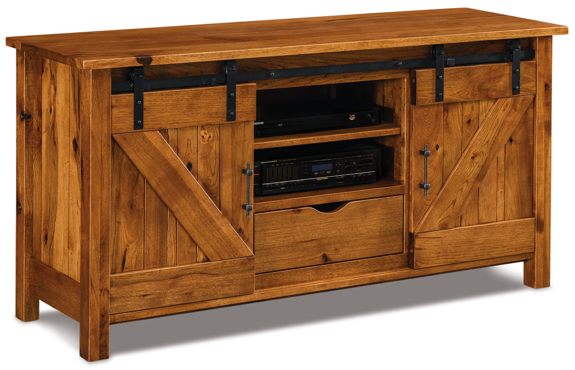 A farmhouse-style design combines with rustic hickory hardwood that comes with a light finish in the Timbra Plasma Stand. The result? A modern TV cabinet with a hint of rustic. Notice the barn door slides. Also, the Swedish iron door pull hardware. Also, you’ll find an adjustable shelf behind each door. And the drawer opens full extension. The TV stand is sturdy. Durable. Plus heirloom-quality!